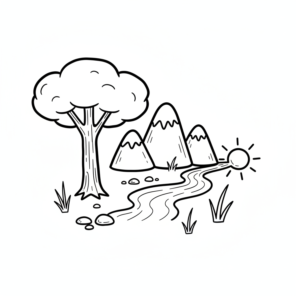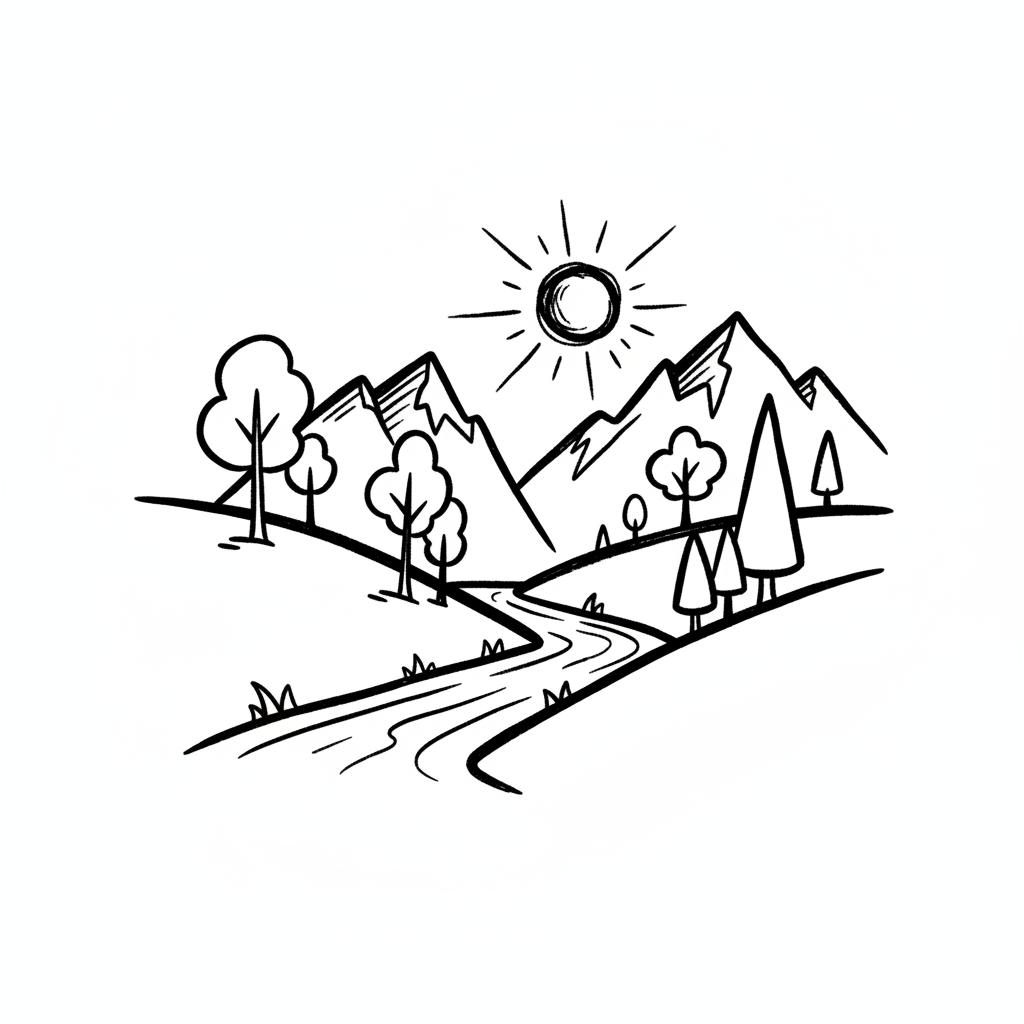 Einfache Strichzeichnung einer Naturlandschaft mit Baum, Bergen, Fluss und Sonne.