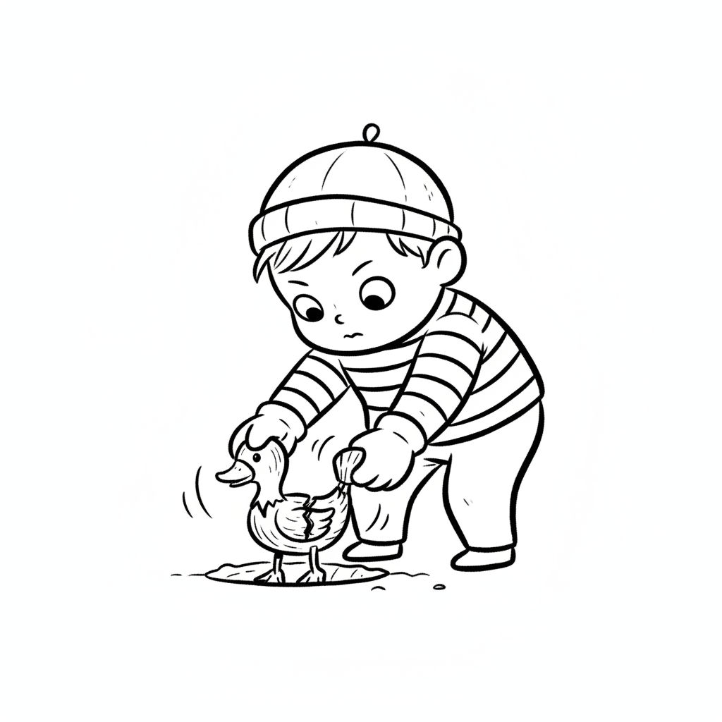Niedlicher Cartoon-Junge mit Mütze hält eine Ente in einer Pfütze. Schwarz-weiß-Malvorlage.