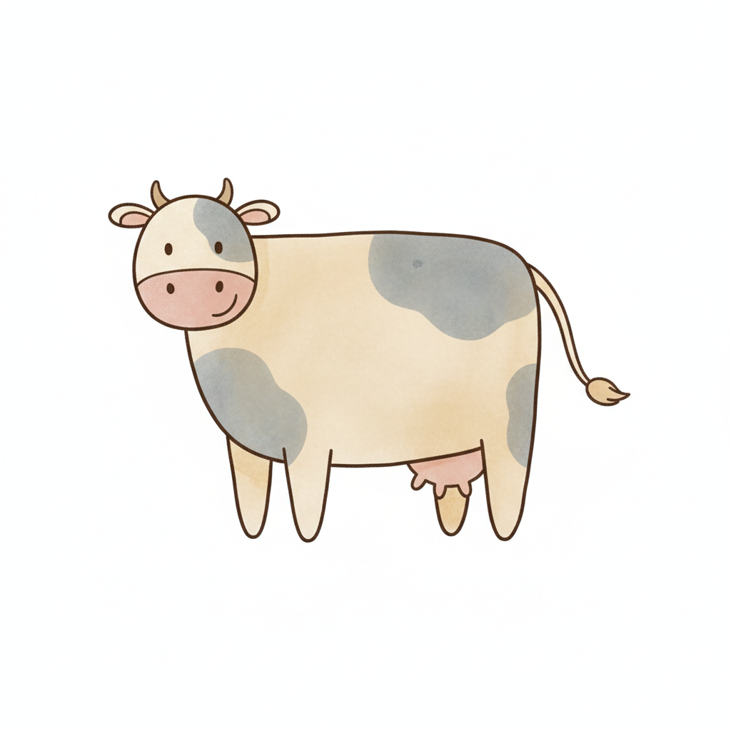 Eine niedliche, cartoonartige Kuh mit grauen Flecken.