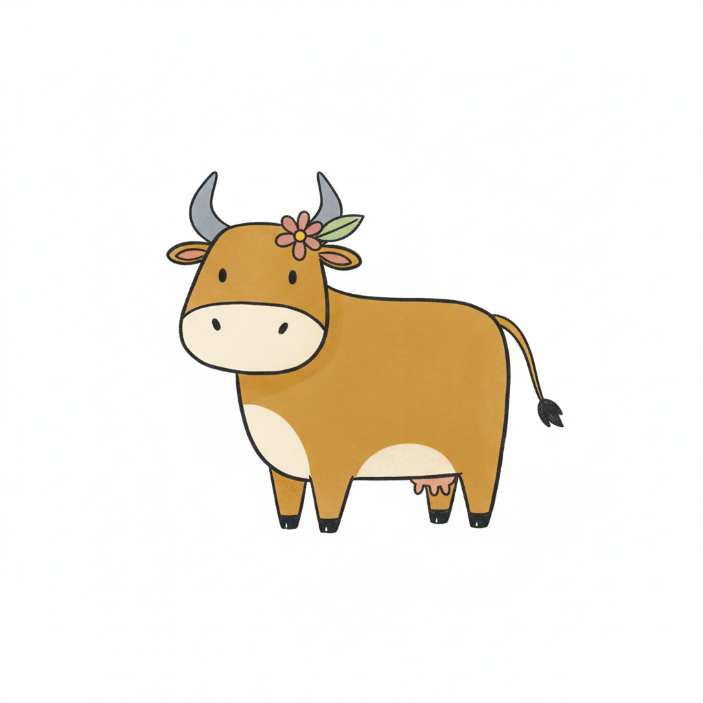 Eine niedliche, cartoonhafte Kuh mit einer Blume im Horn.