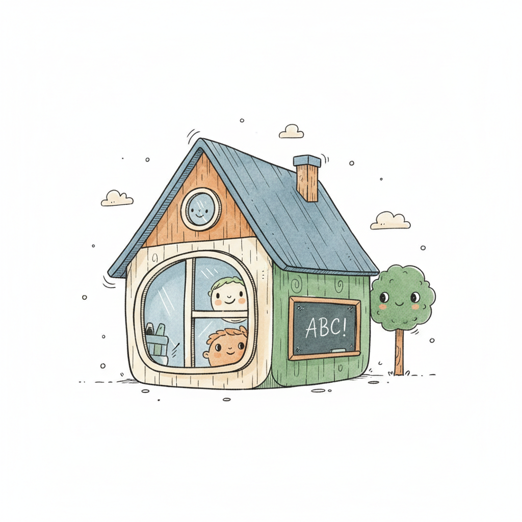 Eine süße, bunte Schule mit zwei Kindern und einem Baum.
