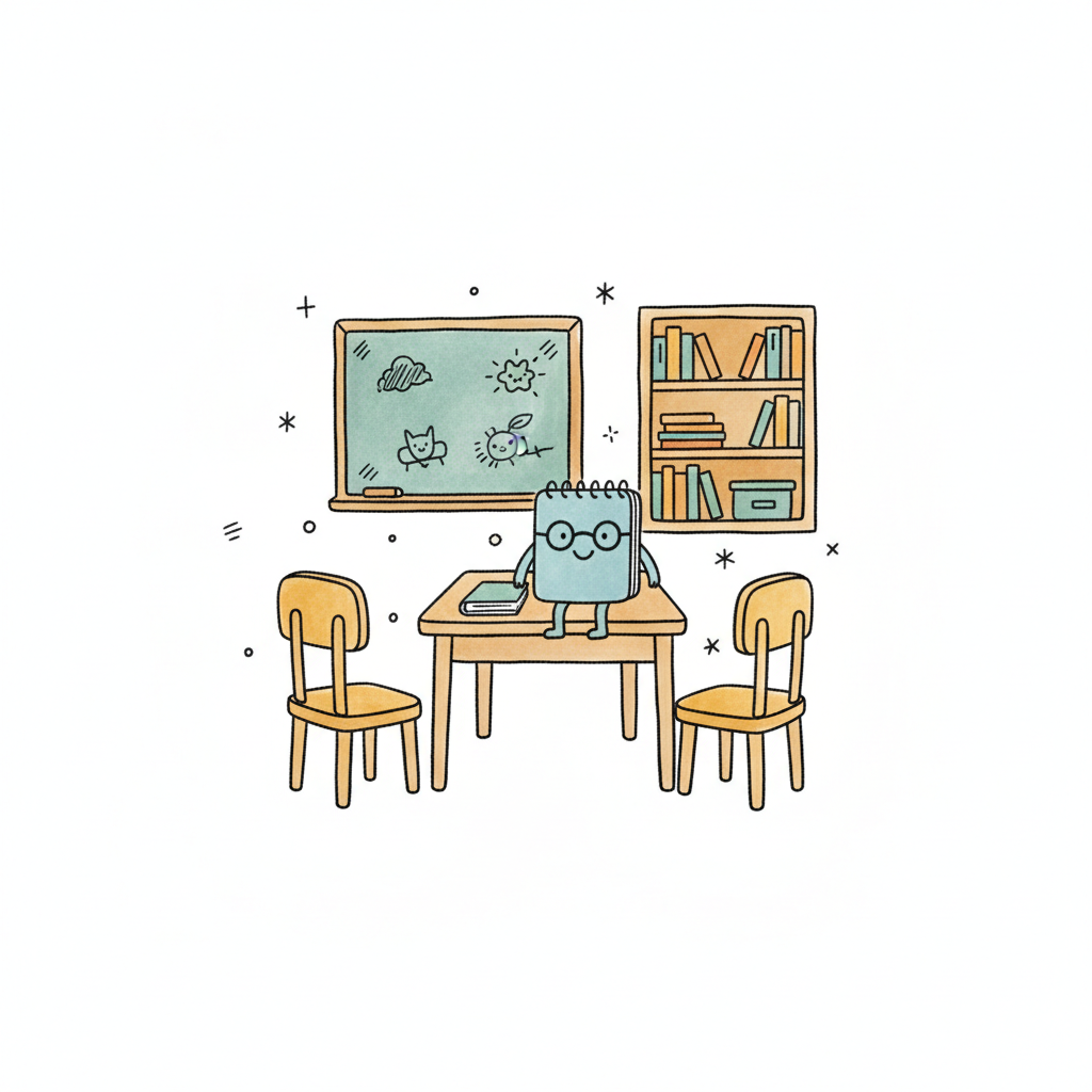 Ein niedliches, cartoonhaftes Klassenzimmer mit einem außergewöhnlichen Schüler.