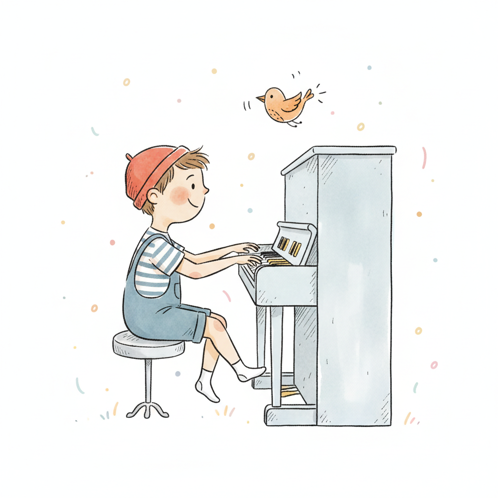 Ein Junge spielt am Klavier, während ein Vogel darüber fliegt.