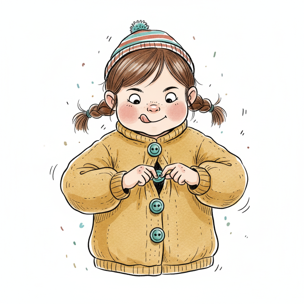 Ein fröhliches Mädchen in einem gelben Pullover mit Mütze, das an einer Knopfleiste spielt.