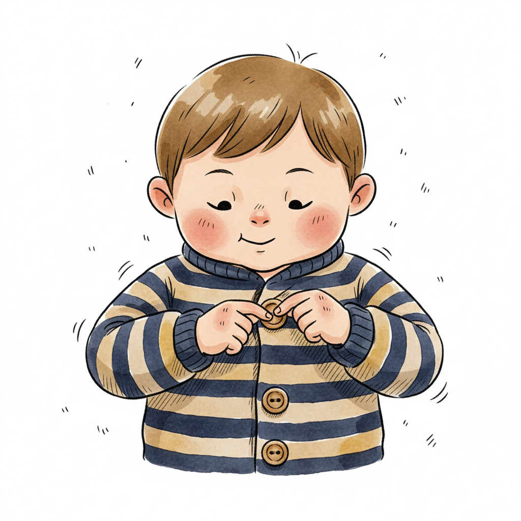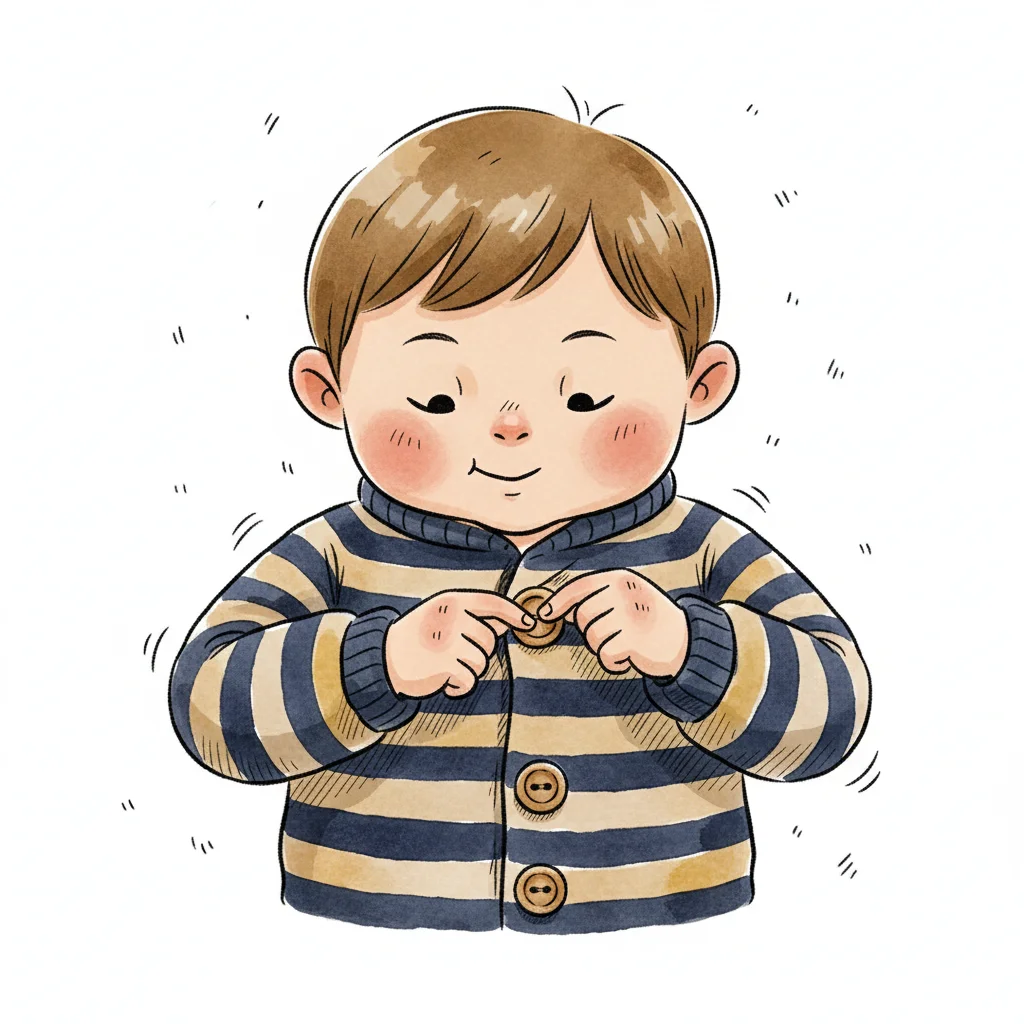 Ein Junge im gestreiften Pullover spielt mit einem Knopf und lächelt.