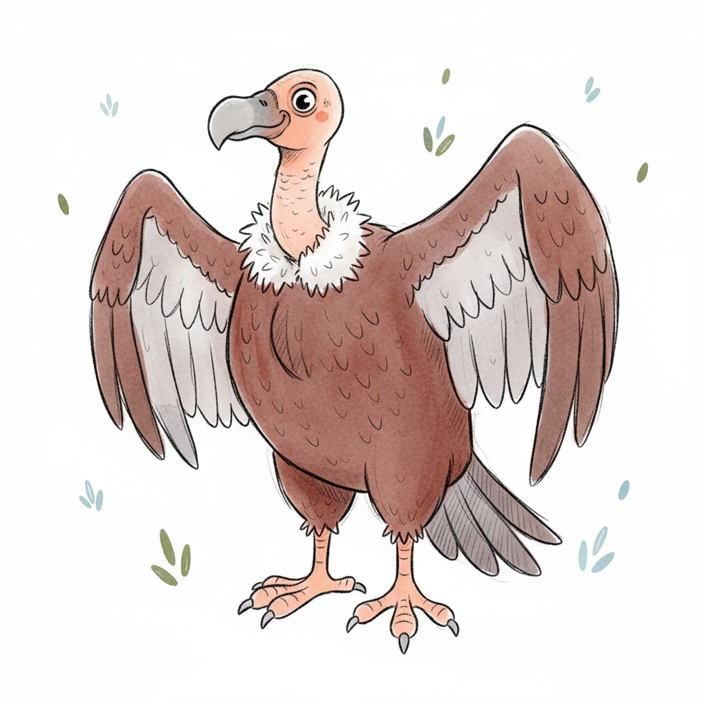 Ein Cartoon-Geier mit ausgebreiteten Flügeln und freundlichem Blick.