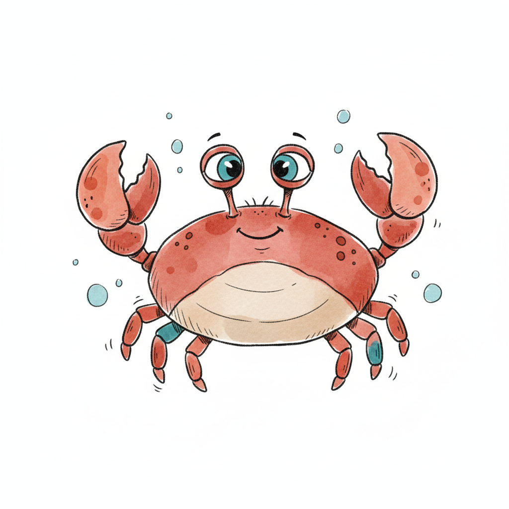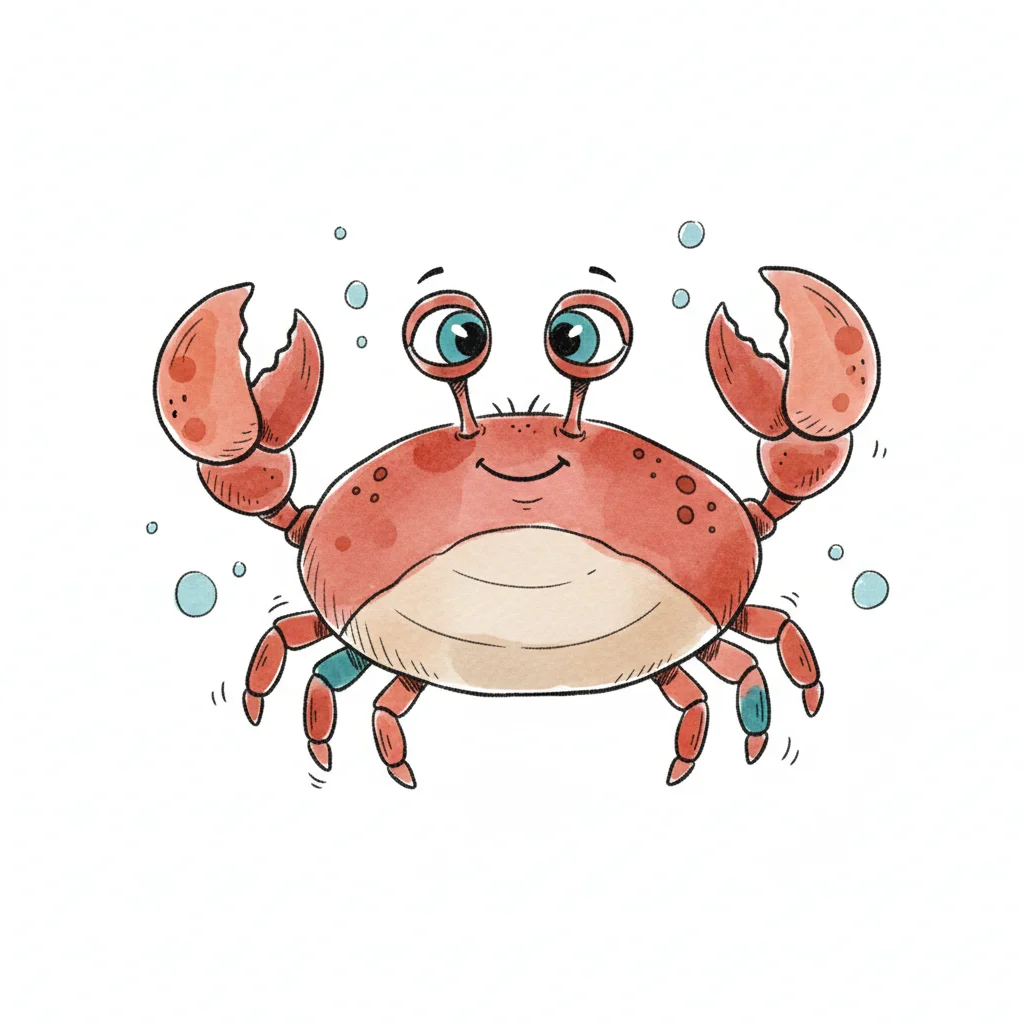 Eine niedliche, cartoonhafte Krabbe mit großen Augen und fröhlichem Gesicht.
