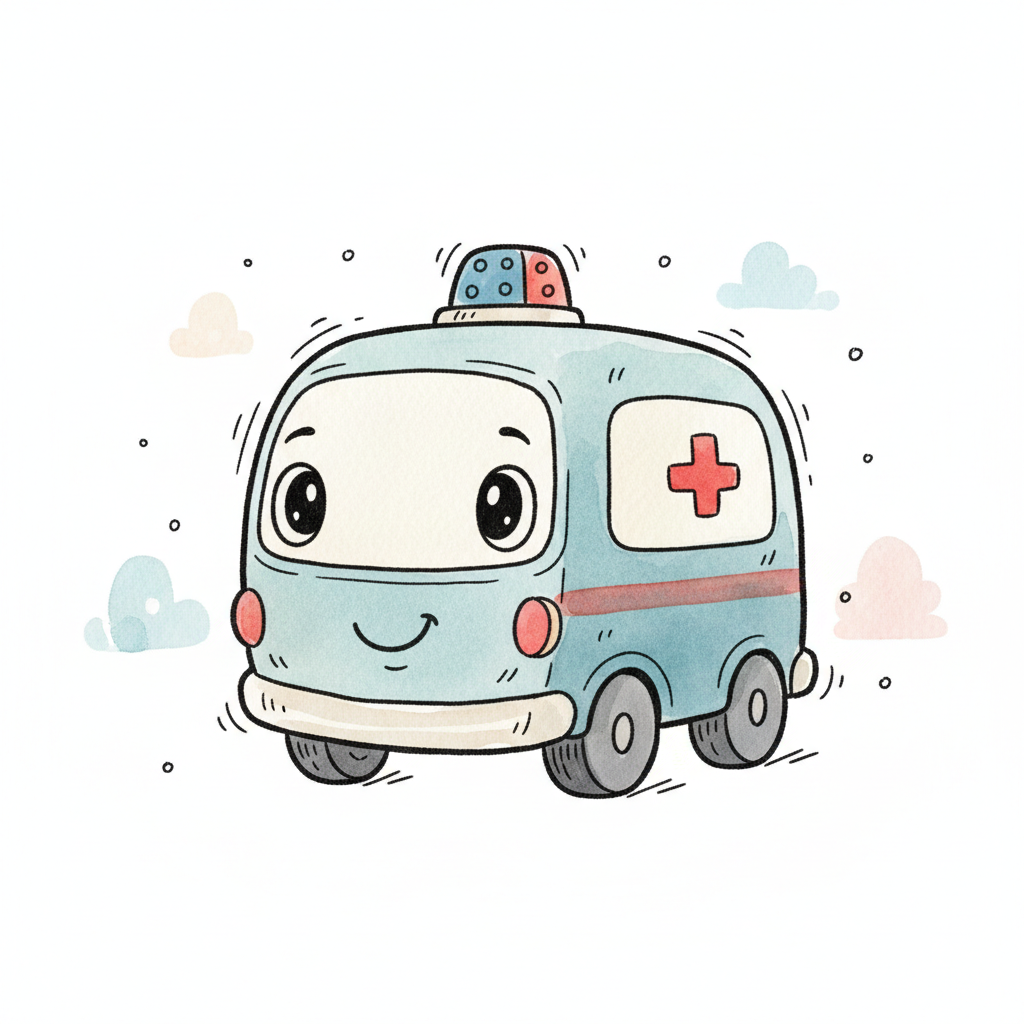 Süßes, cartoonhaftes Krankenwagen mit lächelndem Gesicht und rotem Kreuz.