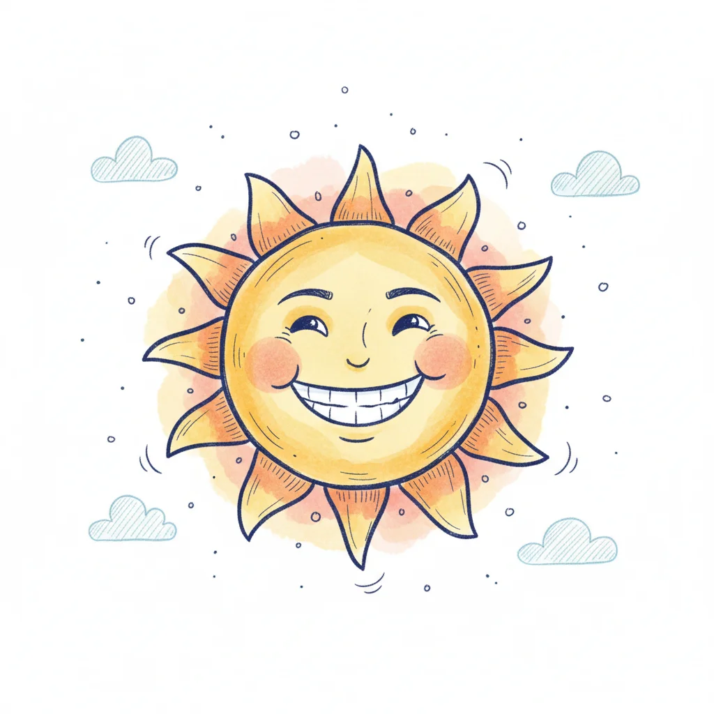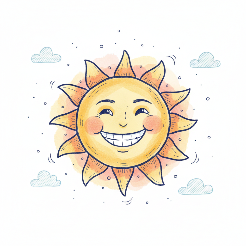 Ein fröhlicher, lächelnder Sonnen-Charakter mit Wolken im Hintergrund.