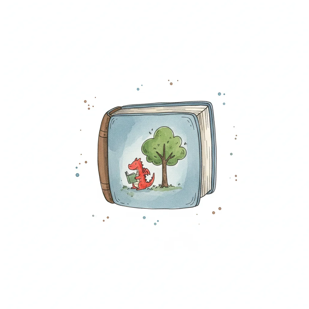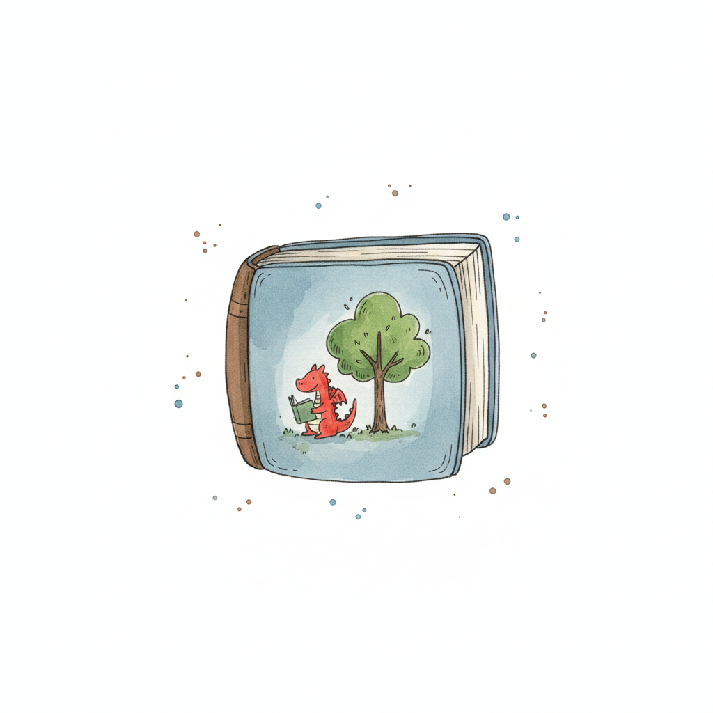 Ein illustriertes Buch mit einem Drachen und einem Baum.