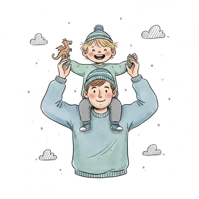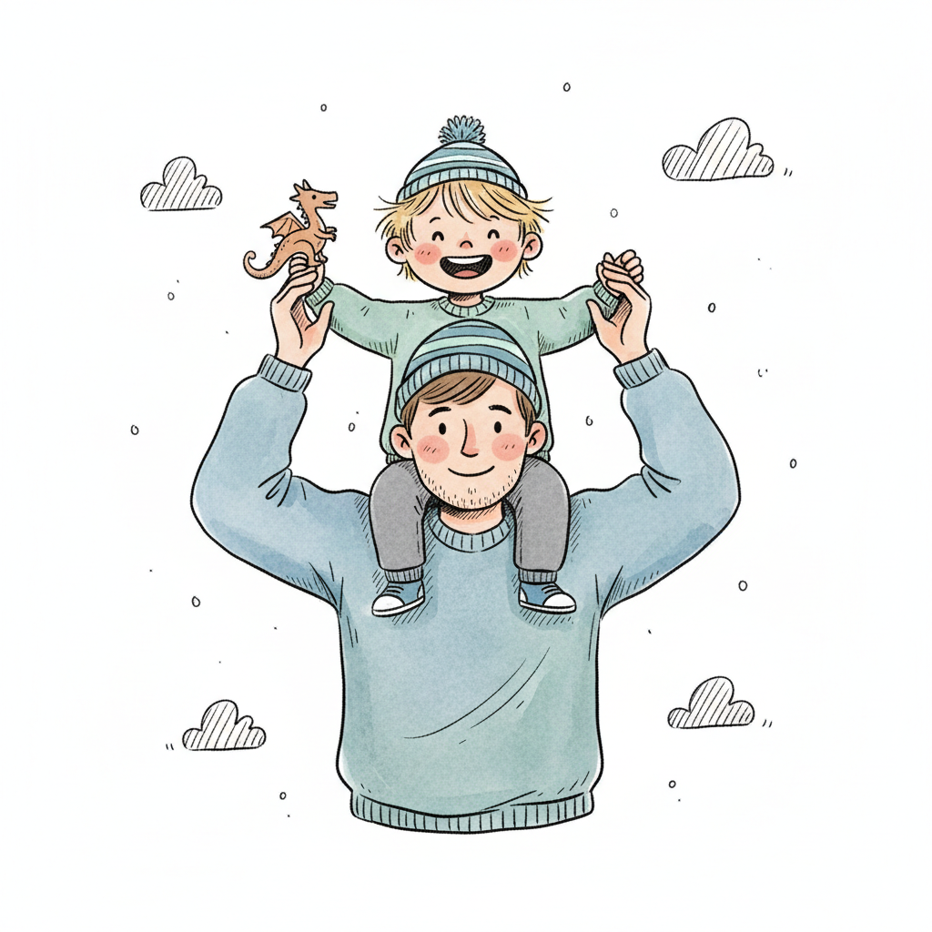 Vater trägt fröhlichen Sohn auf den Schultern, beide in Mützen mit Drachen-Spielzeug.