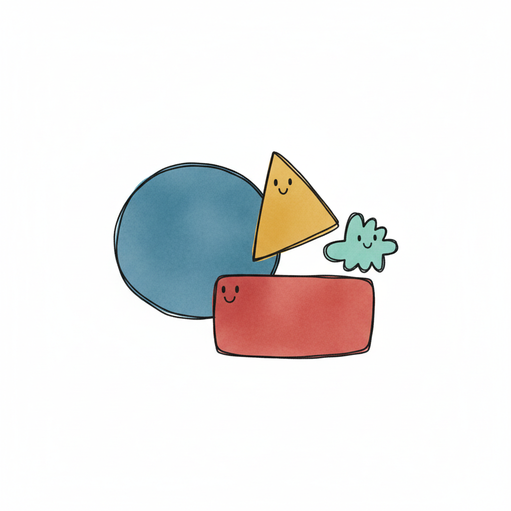Vier bunte, lächelnde Formen: Kreis, Dreieck, Rechteck und eine Wolke, handgezeichnet.