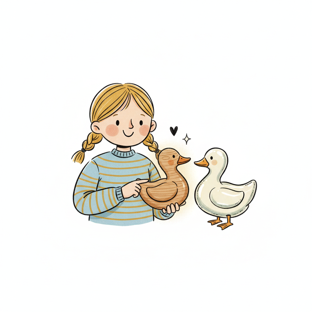 Ein lächelndes Mädchen mit Zöpfen hält eine Holzente, neben einer weißen Ente. Süße Illustration.
