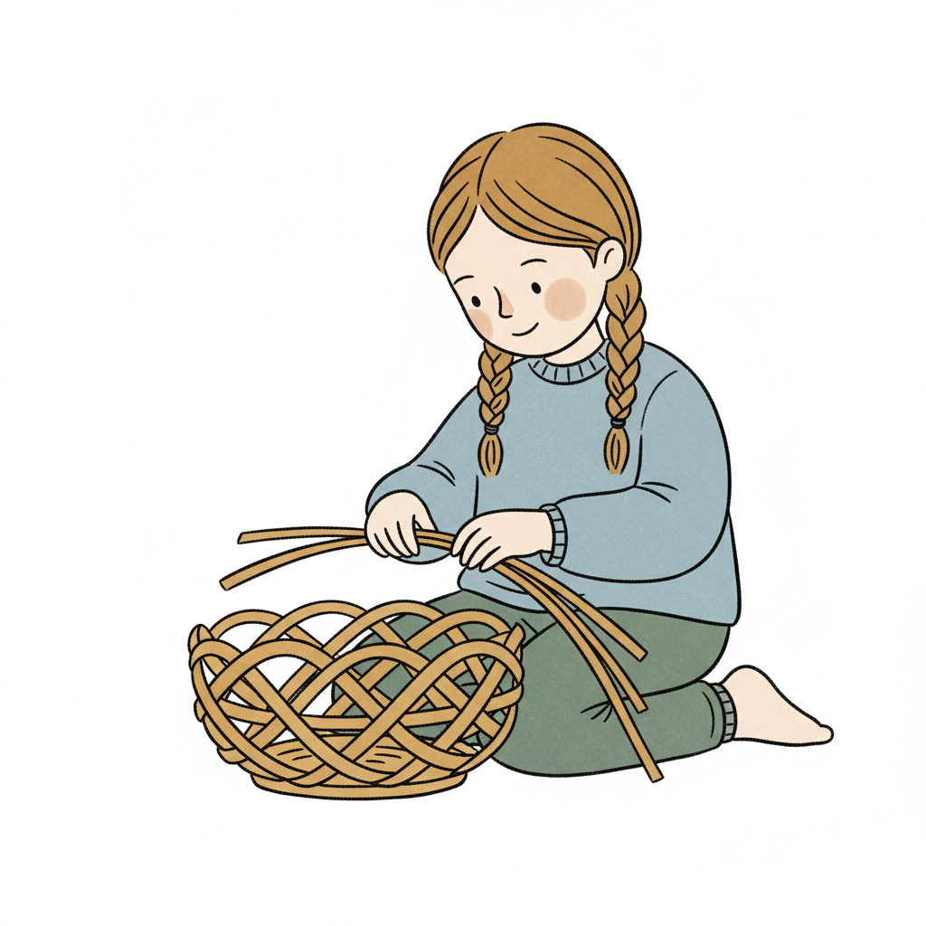 Ein lächelndes Mädchen mit Zöpfen flechtet einen Weidenkorb auf dem Boden.