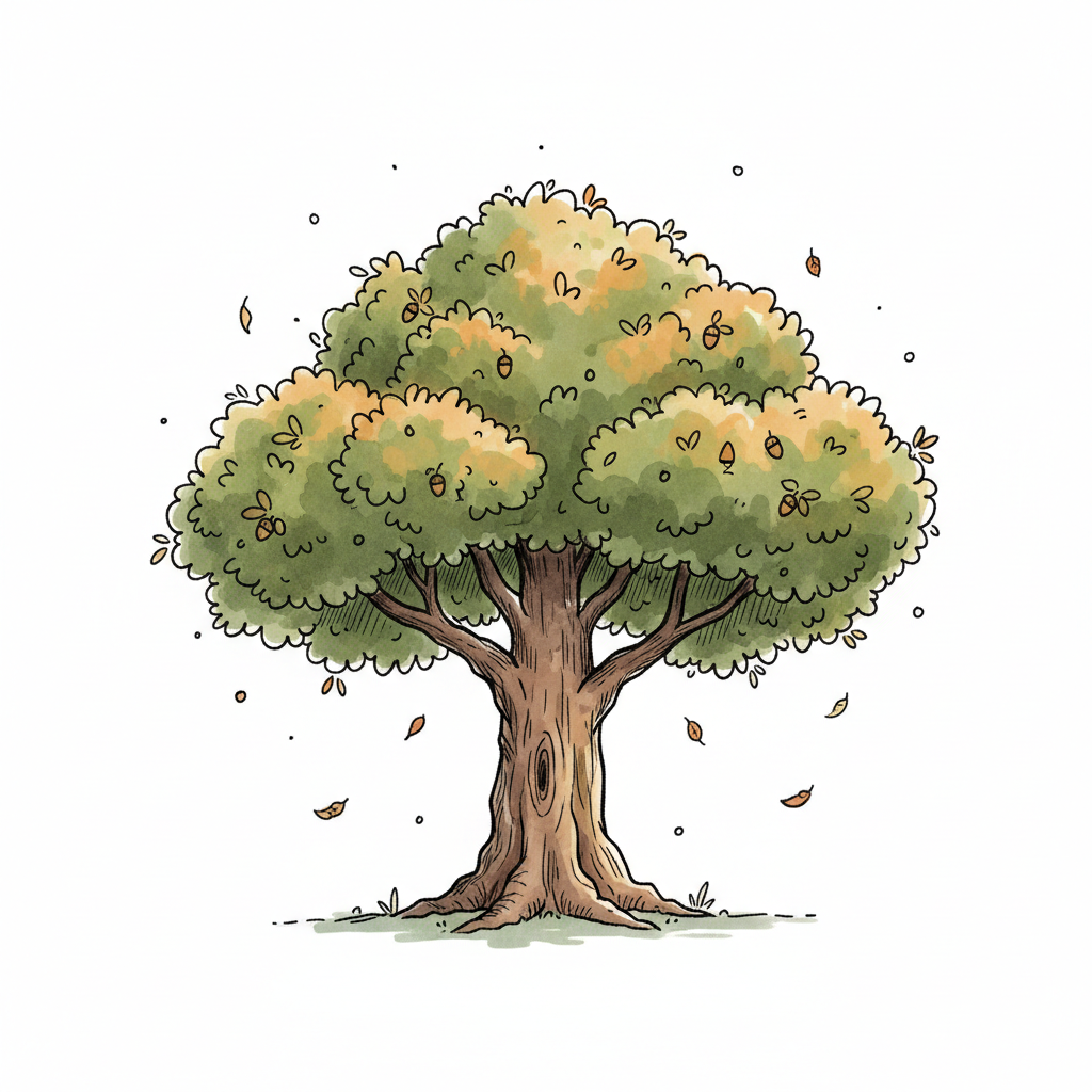 Ein stehender Baum mit grünen Blättern und fallenden Blättern.