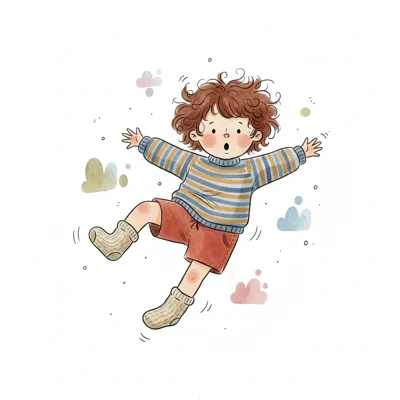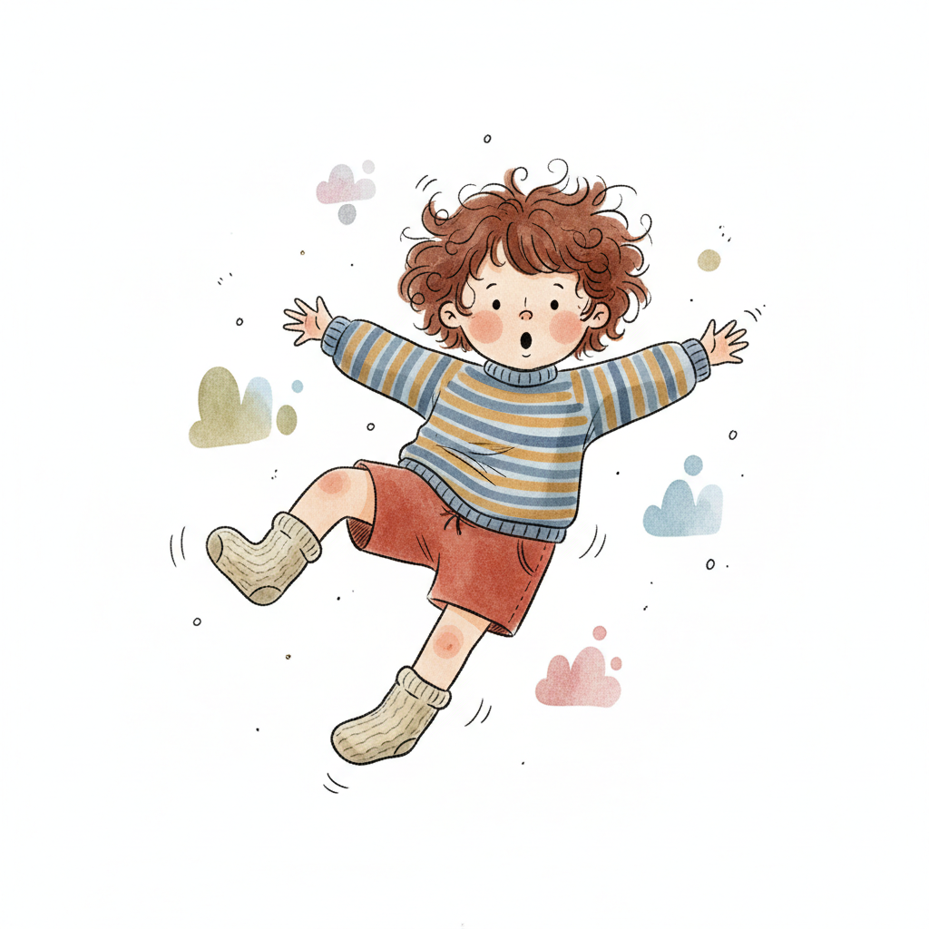 Niedliche, kindgerecht illustrierte Szene mit einem Kind oder einer Person als Hauptfigur, vor rein weißem Hintergrund, im frech-nordischen Aquarell-Skizzenstil. Klare, leicht wackelige Tuschekonturen, sichtbare Pinsel- und Strichtextur, dezente Schraffuren, weiche handgemalte Farbflächen in gedeckten Farben. Einfache, runde Formen. Keine harten Schatten, sondern sanfte, transparente Aquarellschichten. Leicht raue, handgezeichnete Linien statt glatter Vektorkanten. Subtile, vereinzelte Kritzelpunkte oder kleine Details im Hintergrund (wie Pünktchen oder feine Striche), aber keine echte Umgebung oder Landschaft. Die Figur ist mittig zentriert. Insgesamt charmant, humorvoll, warm und handgemacht wirkend. WICHTIG: Das Bild darf ABSOLUT KEINEN TEXT, KEINE BUCHSTABEN und KEINE ZAHLEN enthalten.