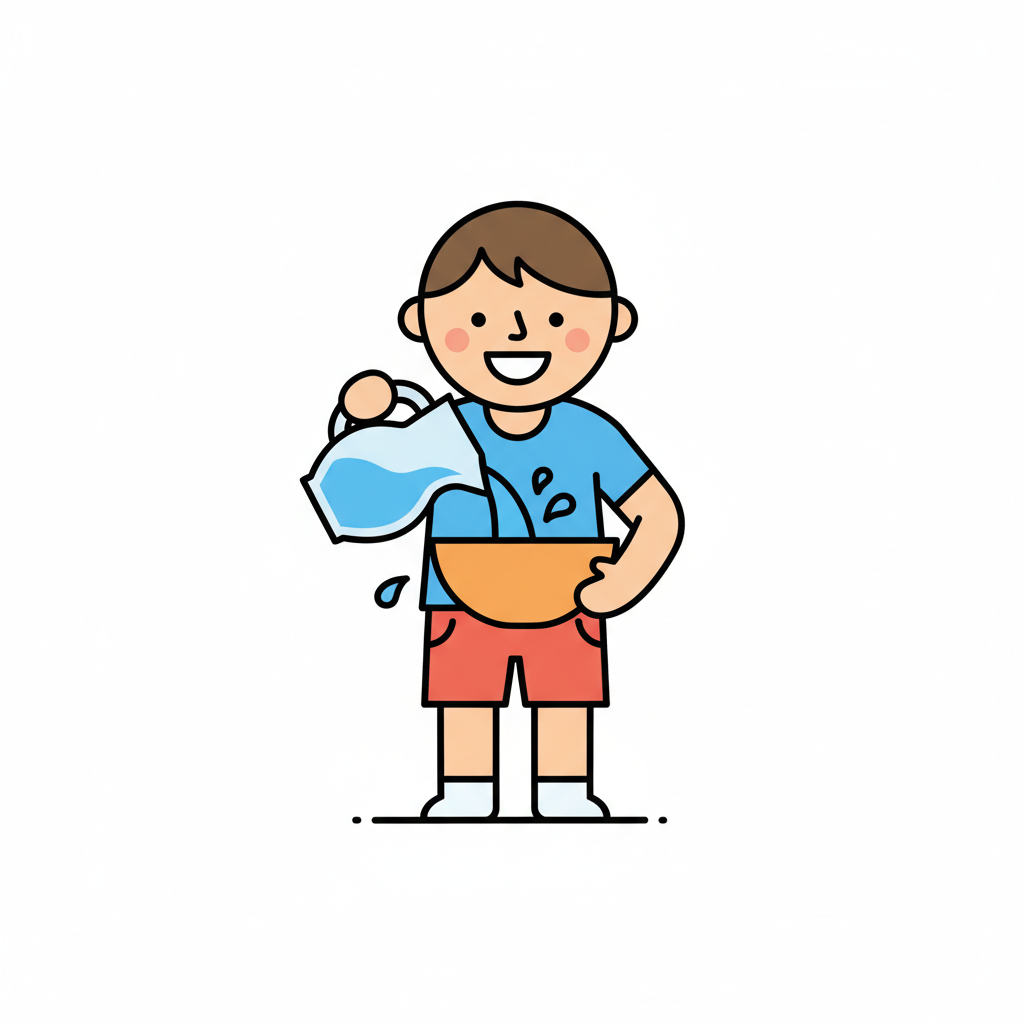 Ein lächelnder Junge gießt Wasser aus einem Krug in eine Schüssel, wobei es spritzt.