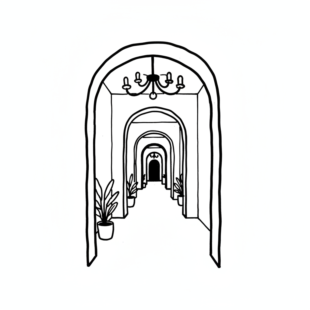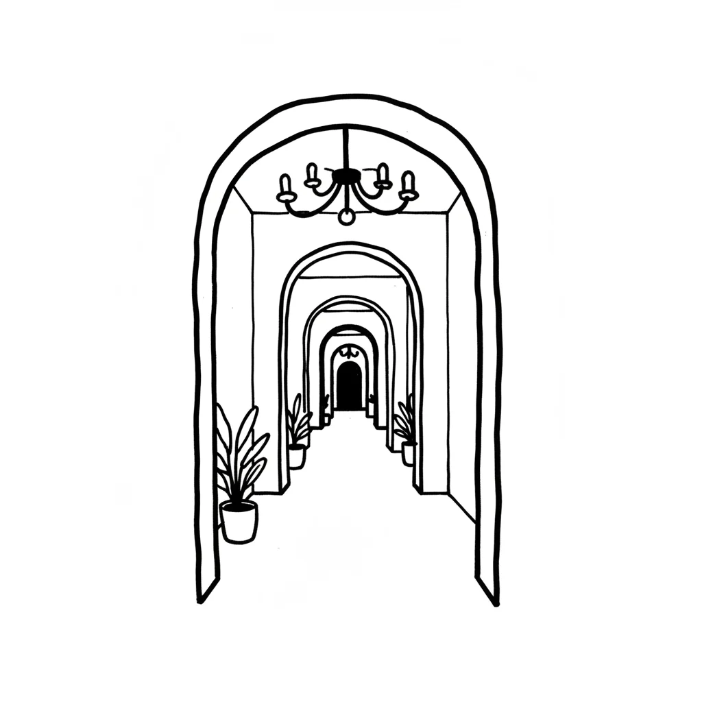 Minimalistische Skizze eines gewölbten Ganges mit Pflanzen und Kronleuchter in Schwarz-Weiß.
