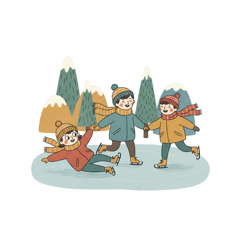 Drei Kinder eislaufen im Winter, eines ist gefallen, die anderen halten Händchen und lächeln.