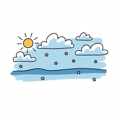 Himmel mit Sonne, Wolken und Sternen über einer Welle.