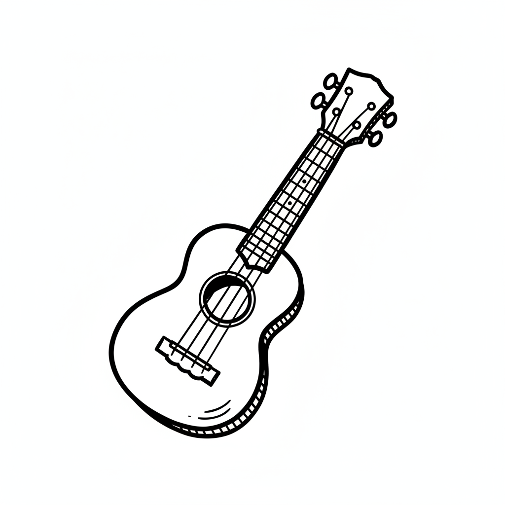 Schwarz-weiße Strichzeichnung einer Ukulele auf weißem Hintergrund.