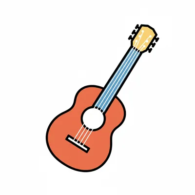 Eine einfache, orangefarbene Cartoon-Gitarre mit blauen Saiten auf weißem Hintergrund.