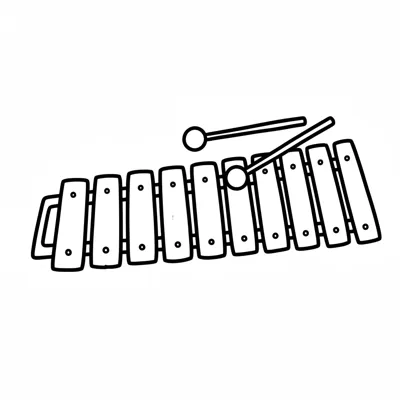 Schwarz-weiße Strichzeichnung eines Xylophons mit zwei Schlägeln auf weißem Hintergrund.