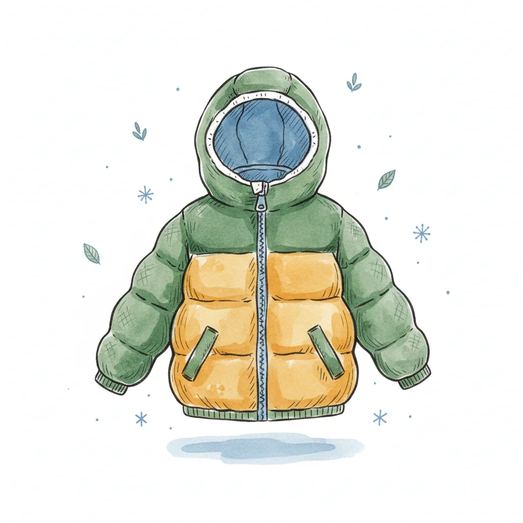 Ein fröhlicher Junge mit Mütze und grüner Jacke zieht sich an.