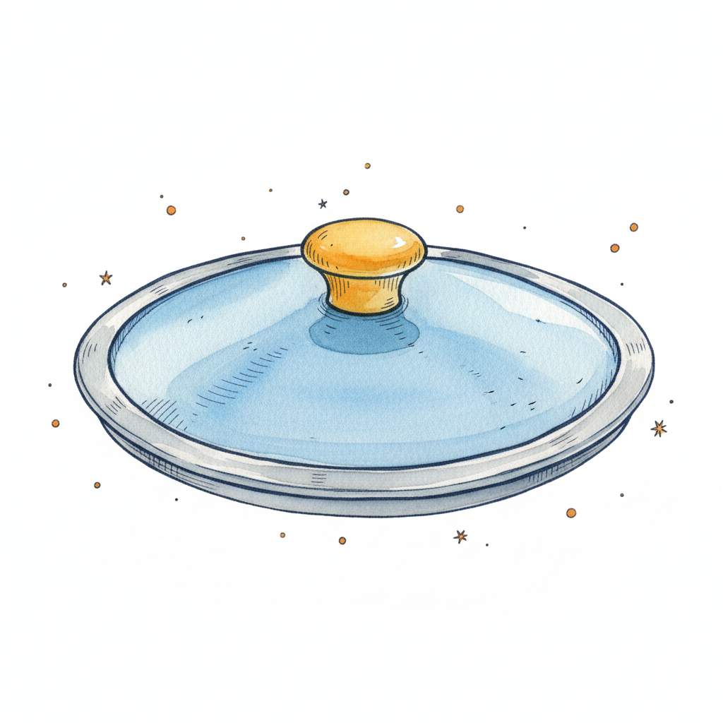 Ein blauer Topfdeckel mit gelbem Griff und funkelnden Umrissen.