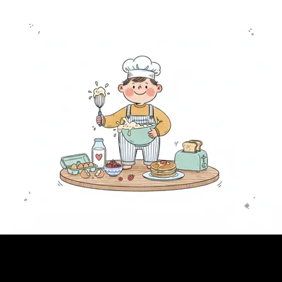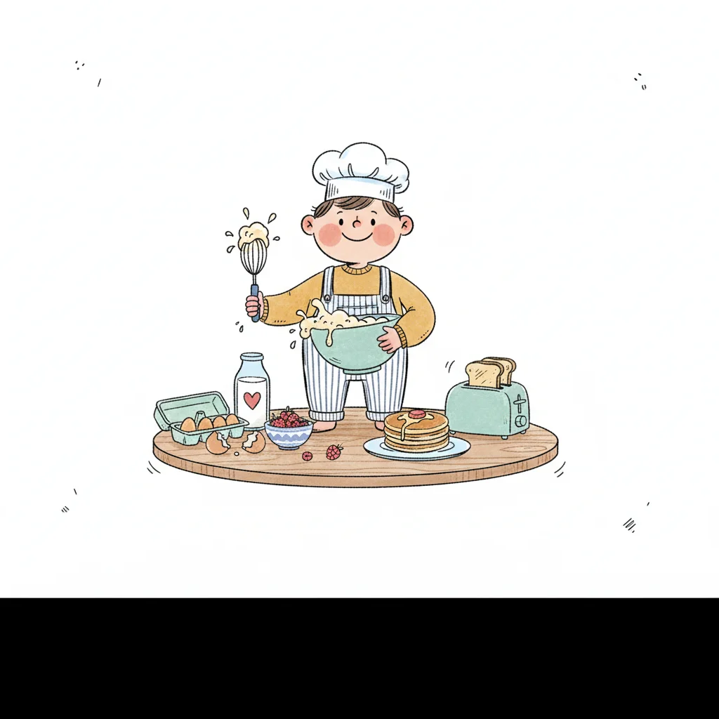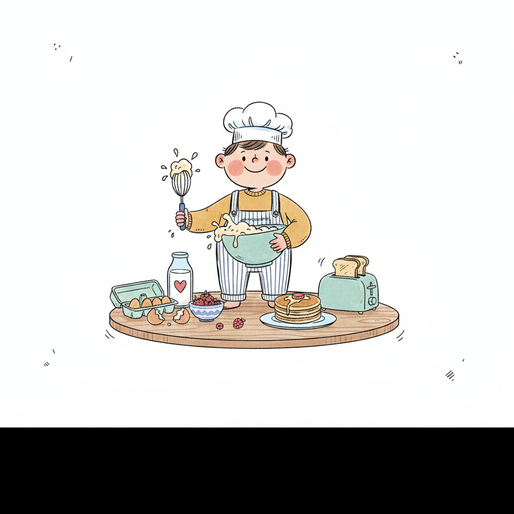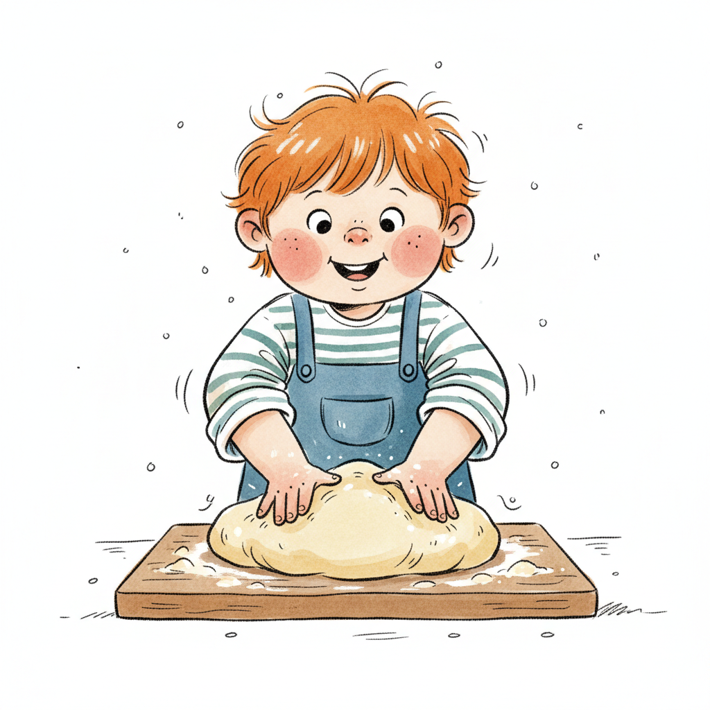 Ein Junge knetet Teig mit Freude in einer Küchenszene.