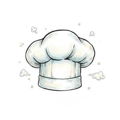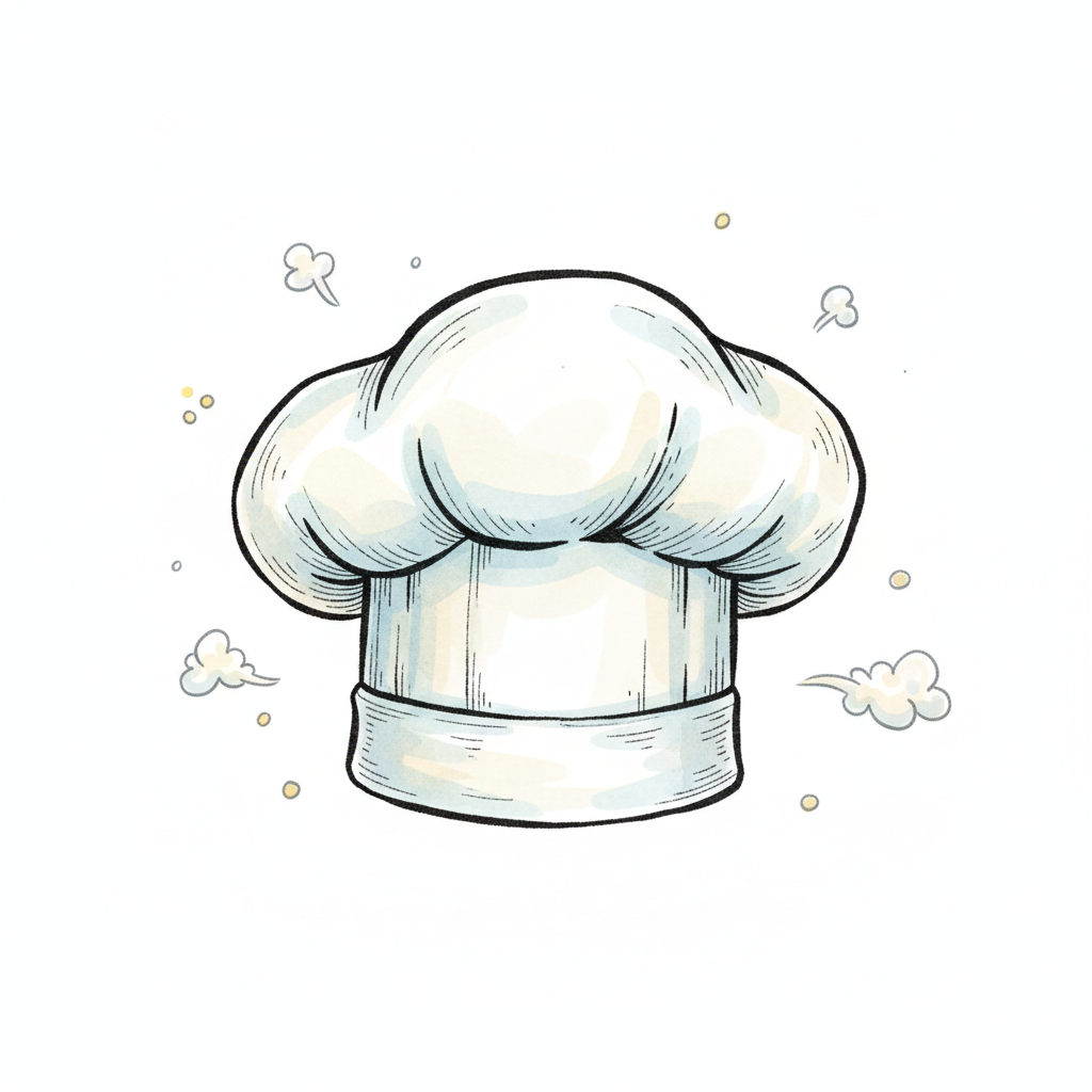 Eine stilisierte Kochmütze mit Wolken umgeben.