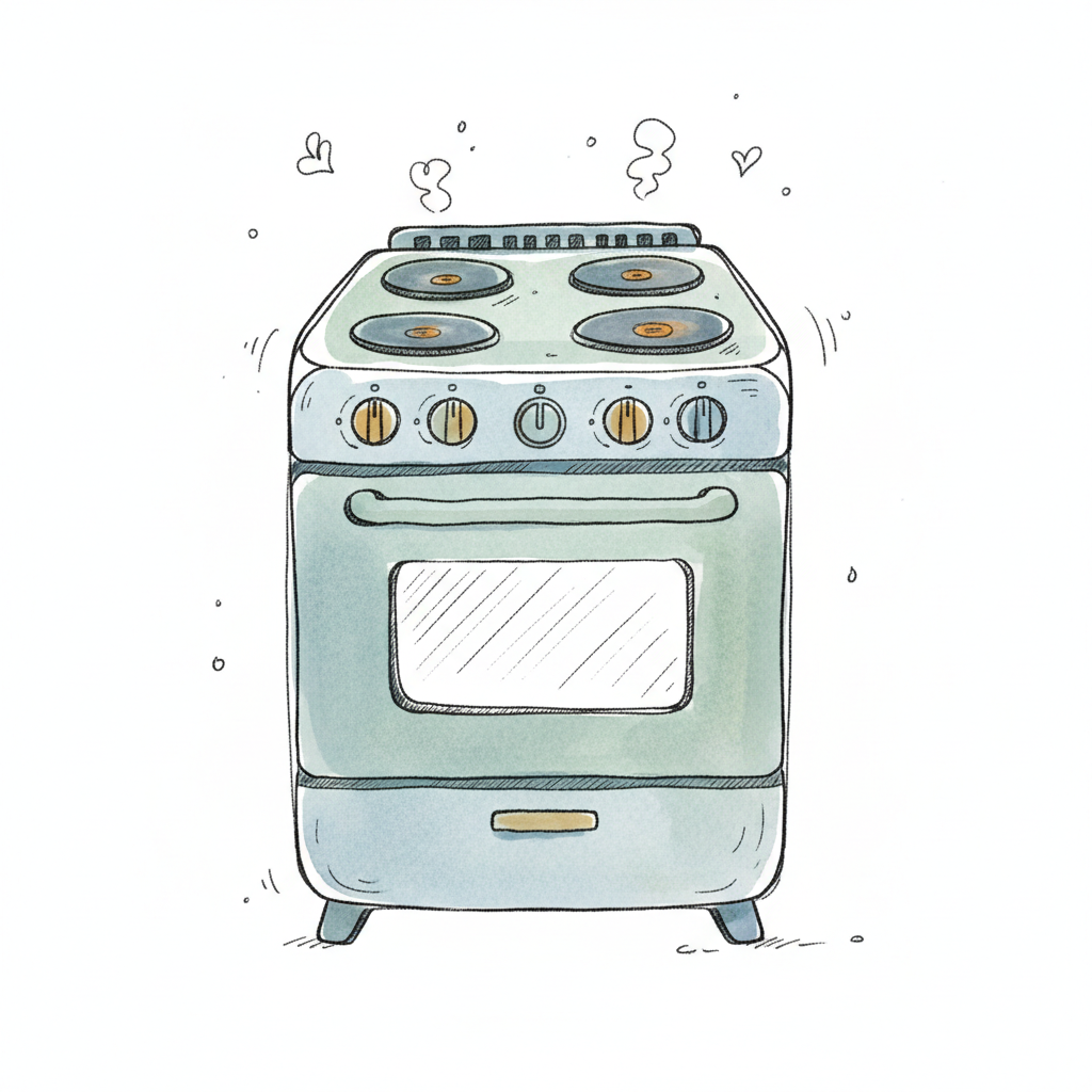 Ein Herd mit dampfenden Kochplatten und einem offenen Ofen.