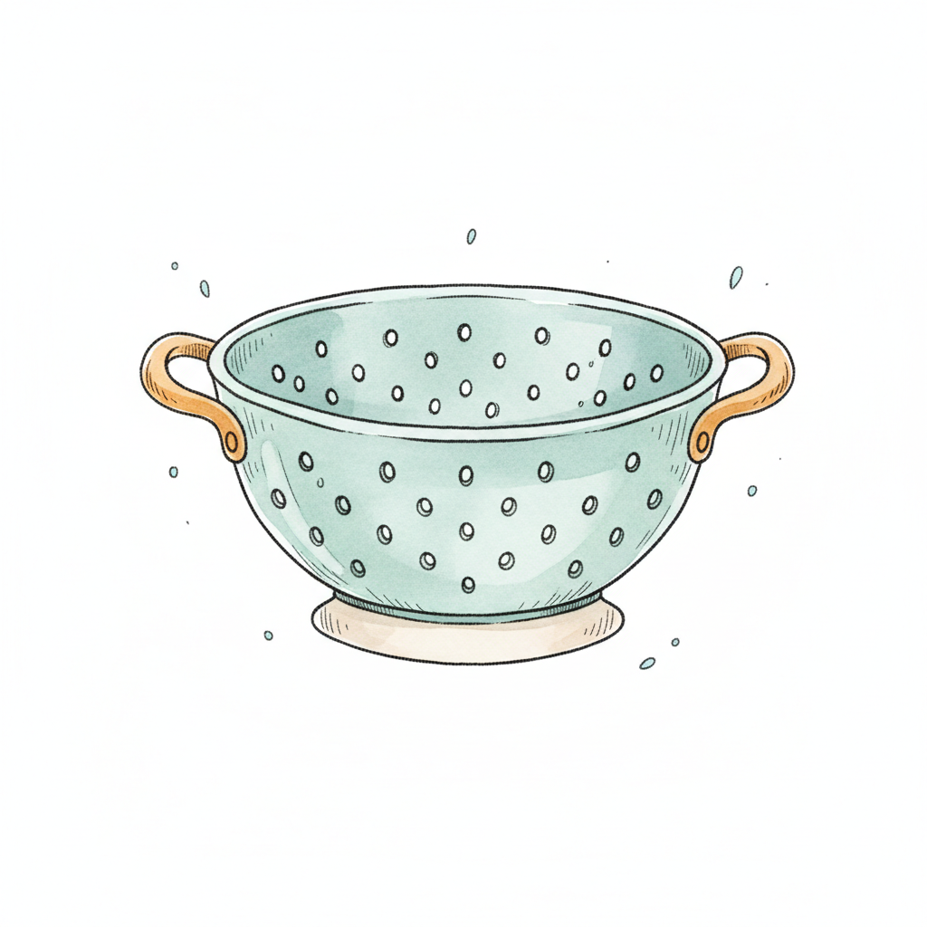 Ein typischer Sieb aus Metall mit einem grünen Farbton und zwei Griffen.