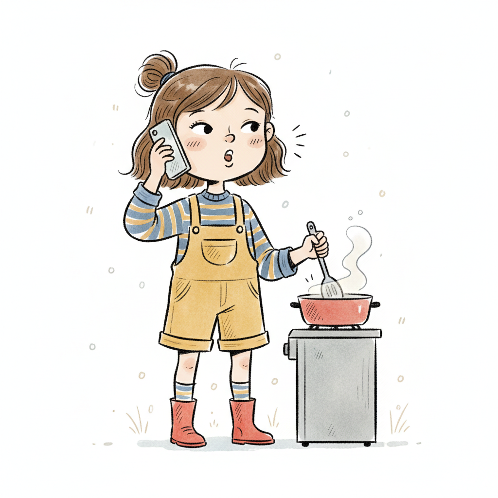 Mädchen kocht und telefoniert, trägt Latzhose und Gummistiefel.