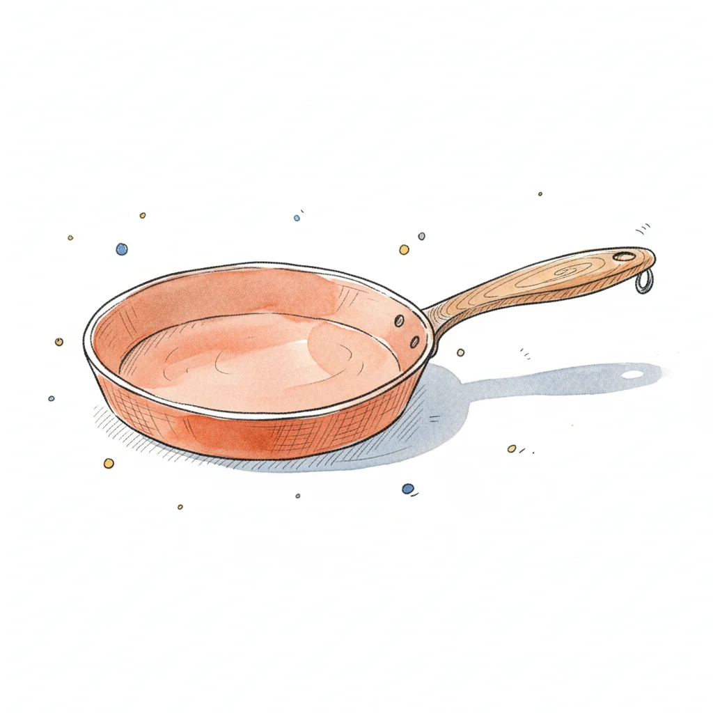 Eine kupferne Bratpfanne mit einem Holzgriff, künstlerisch dargestellt.