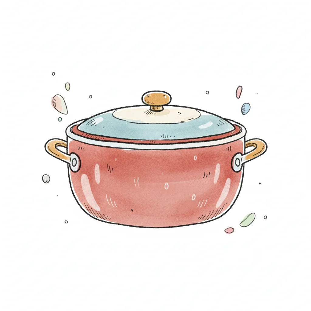 Bunte, stilisierte Kochtopf mit Deckel und schwebenden Zutaten.