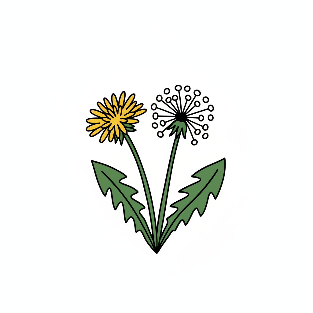 Zeichnung von zwei Löwenzahnblüten mit grünen Blättern.