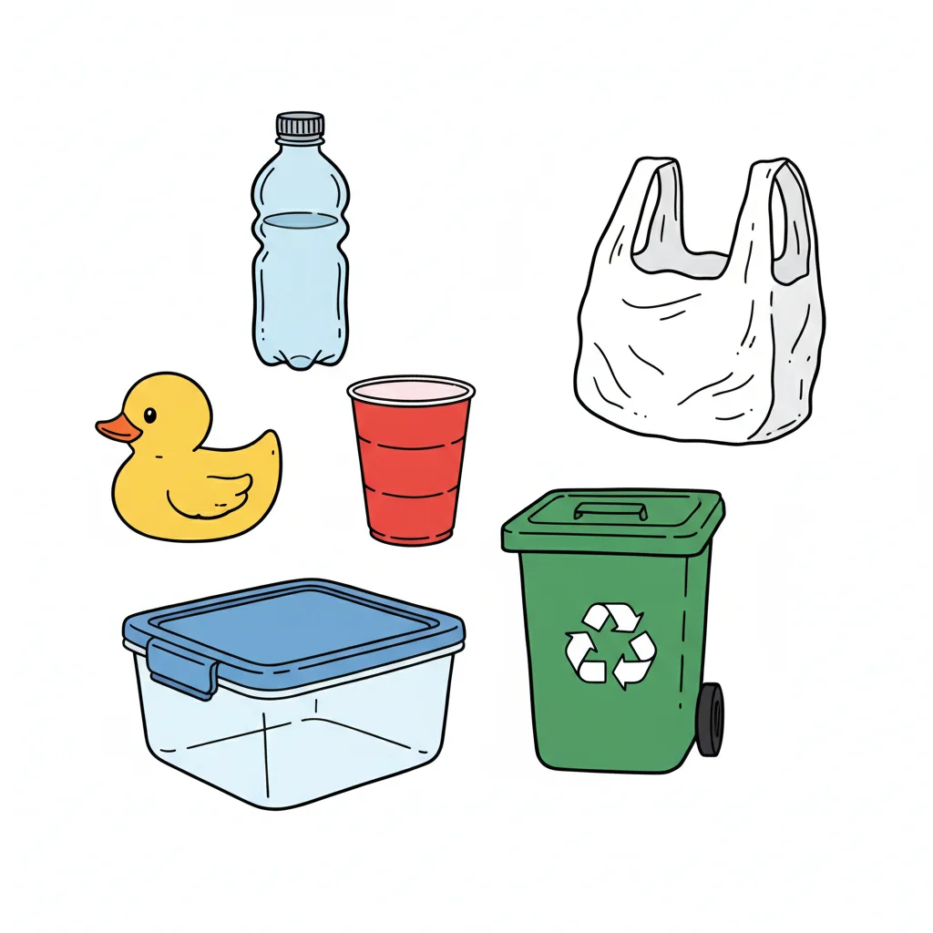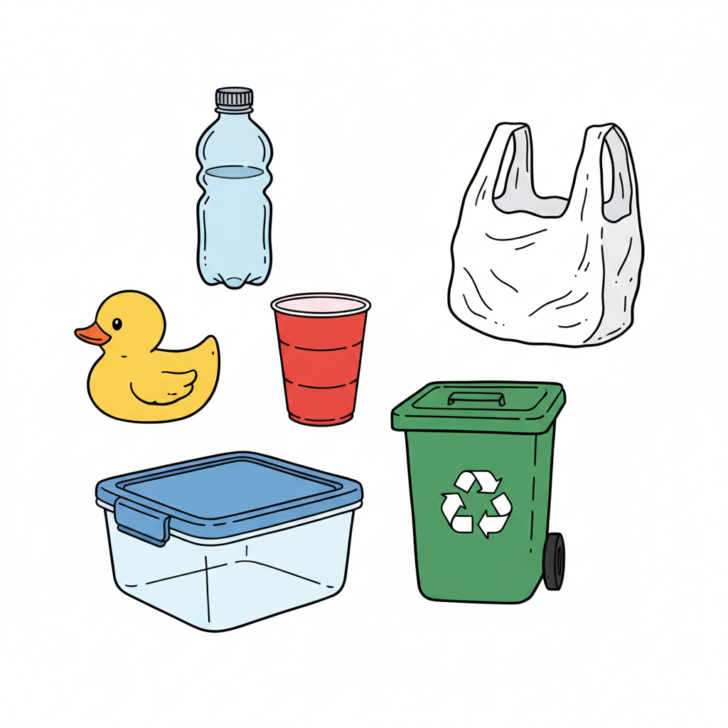 Illustration von Plastikartikeln wie Flasche, Tüte, Becher, Behälter, Ente und einer grünen Recyclingtonne.
