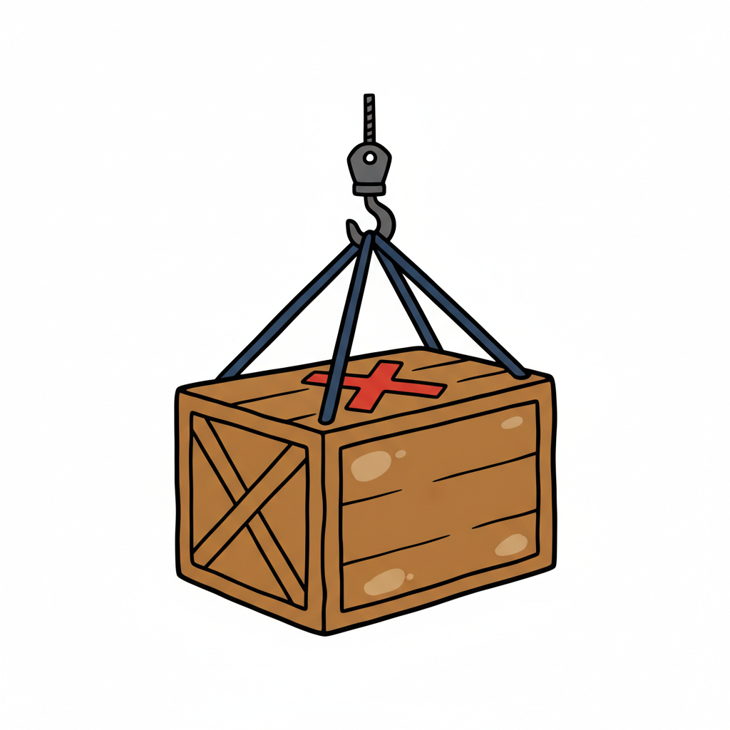 Gezeichnete Holzkiste mit rotem X, die an einem Kranhaken hängt.