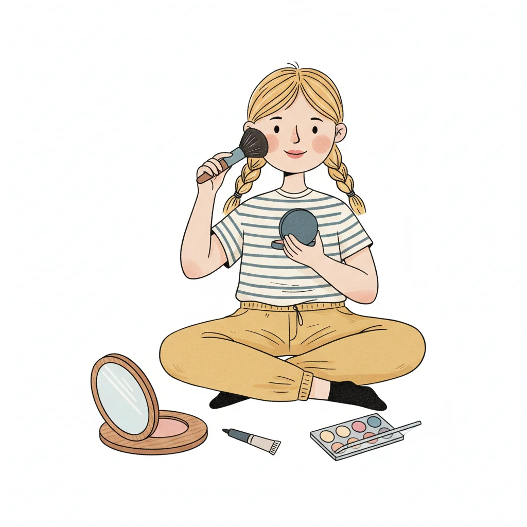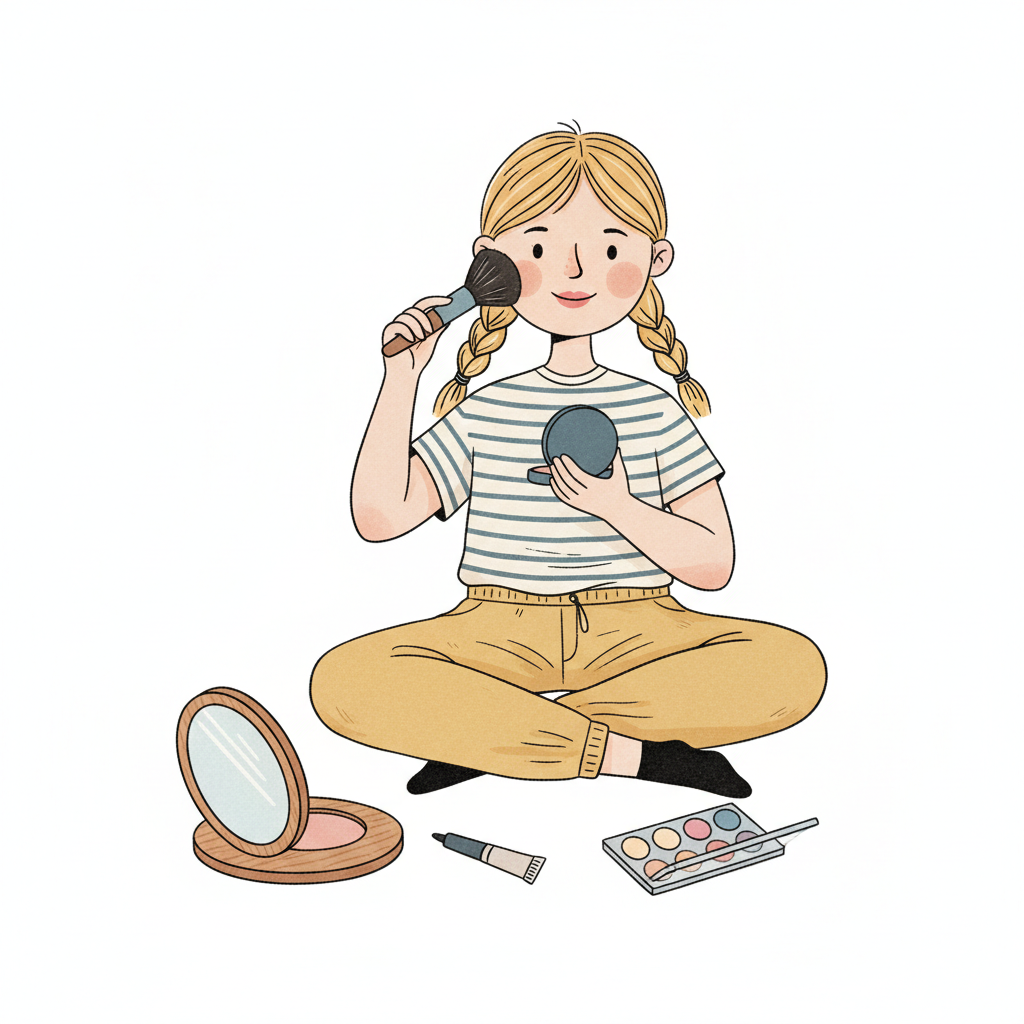 Cartoon-Mädchen schminkt sich mit Pinsel und Spiegel, umgeben von Kosmetikartikeln.