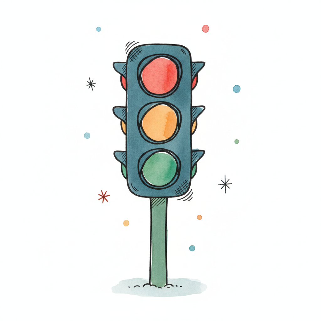 Bunte Aquarell-Ampel mit roten, gelben und grünen Lichtern, umgeben von Punkten und Sternen.