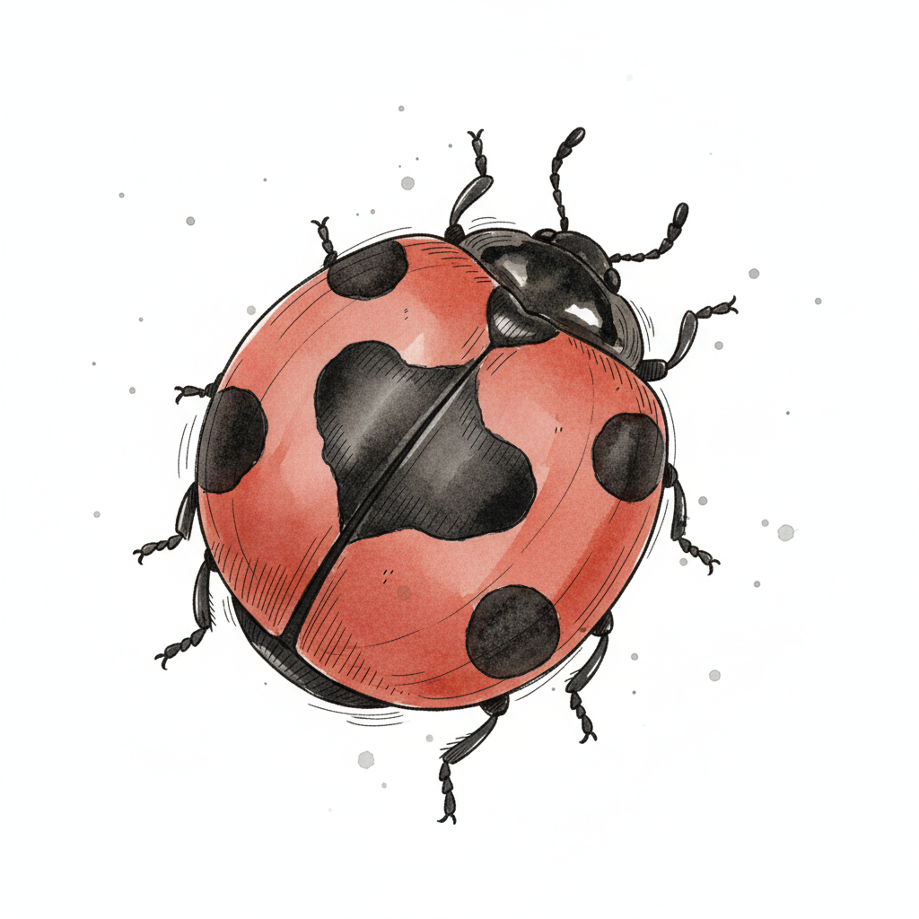 Aquarell-Illustration eines roten Marienkäfers mit schwarzen Punkten auf weißem Hintergrund.