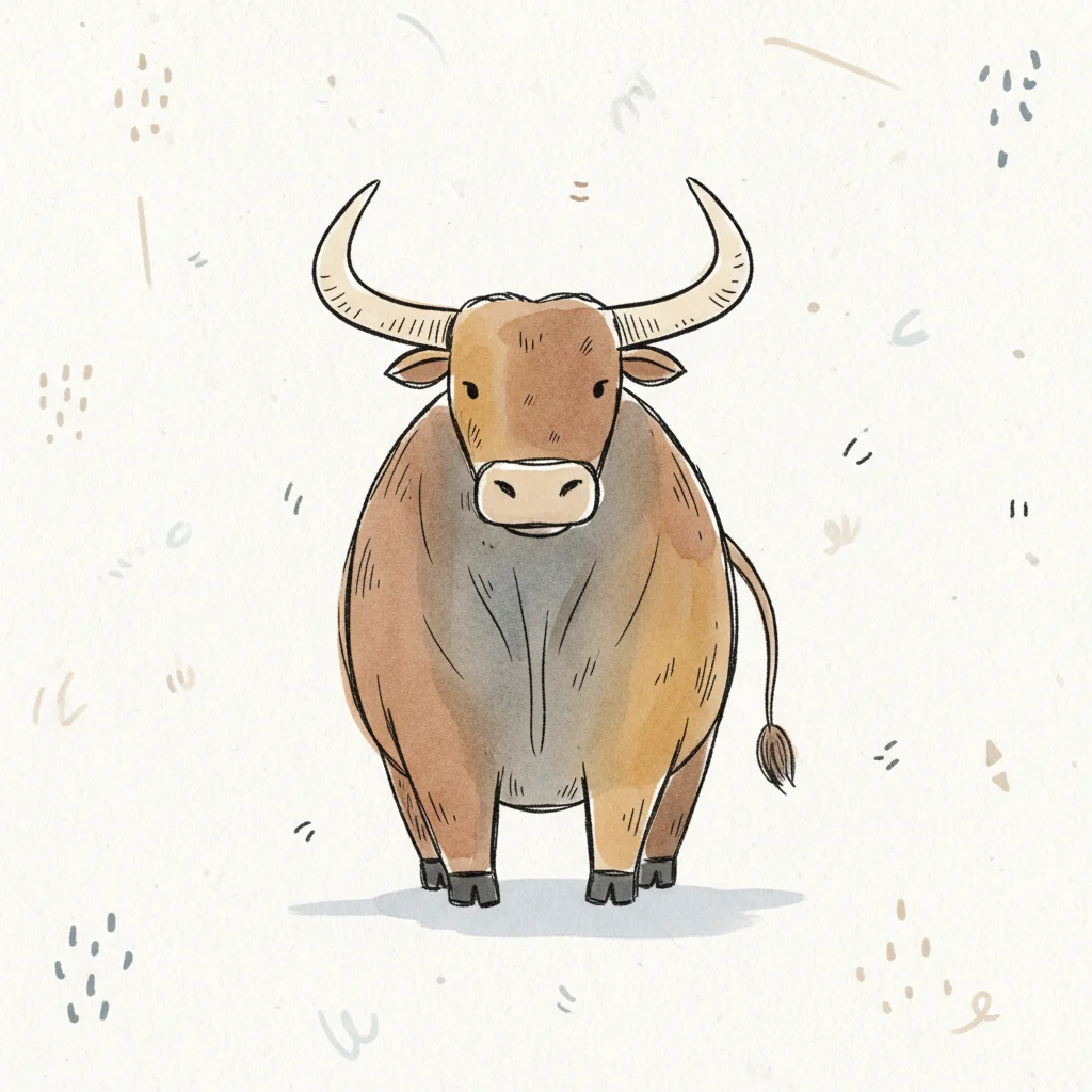 Niedliche, handgezeichnete Illustration eines braunen Stiers mit Hörnern im Aquarell-Stil.