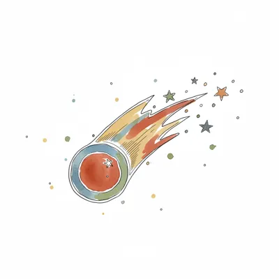 Aquarell-Illustration eines bunten Kometen mit Schweif und umgebenden Sternen auf weißem Grund.