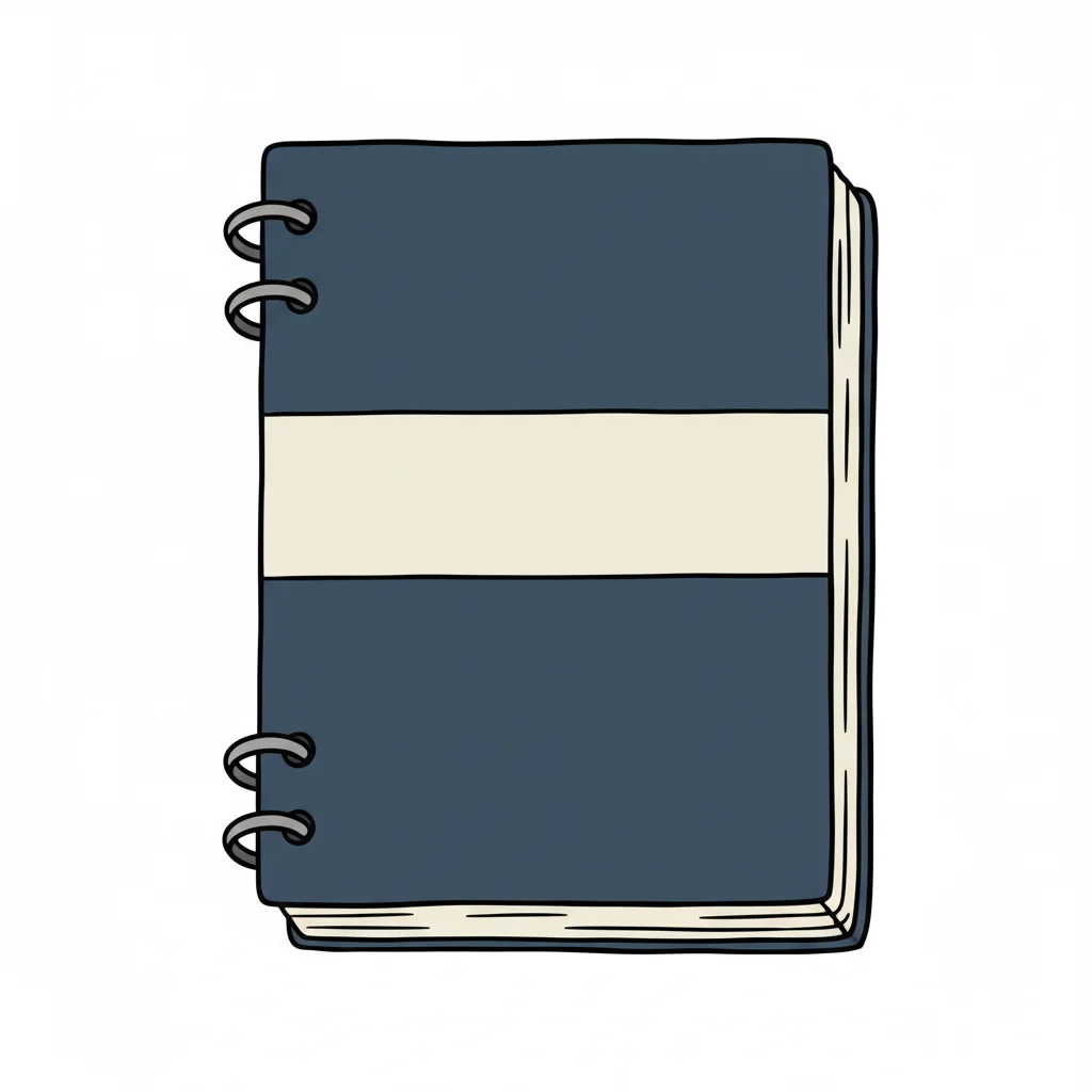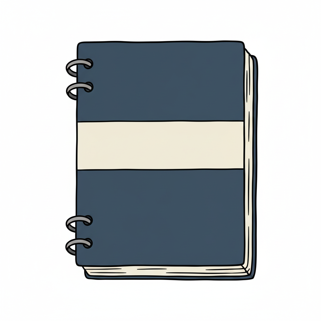 Ein blaues Notizbuch mit einem weißen Streifen auf dem Cover.