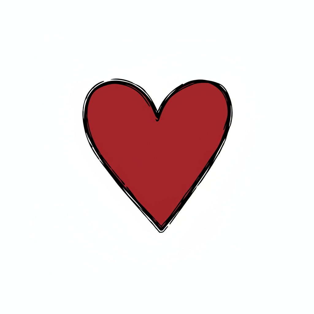 Ein schlichtes, handgezeichnetes rotes Herz mit schwarzem Umriss auf weißem Hintergrund.