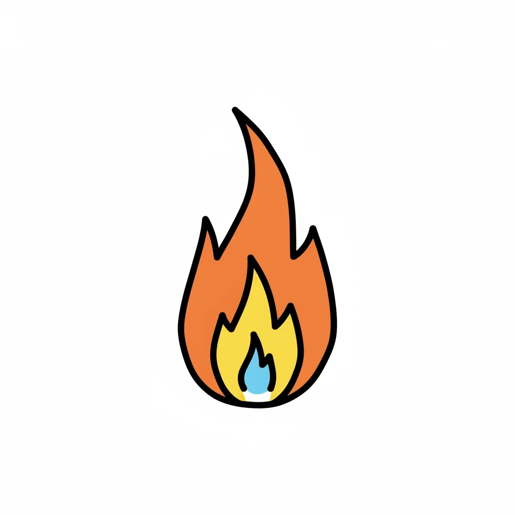 Cartoon-Flamme in Orange, Gelb und Blau mit schwarzem Umriss auf weißem Hintergrund.