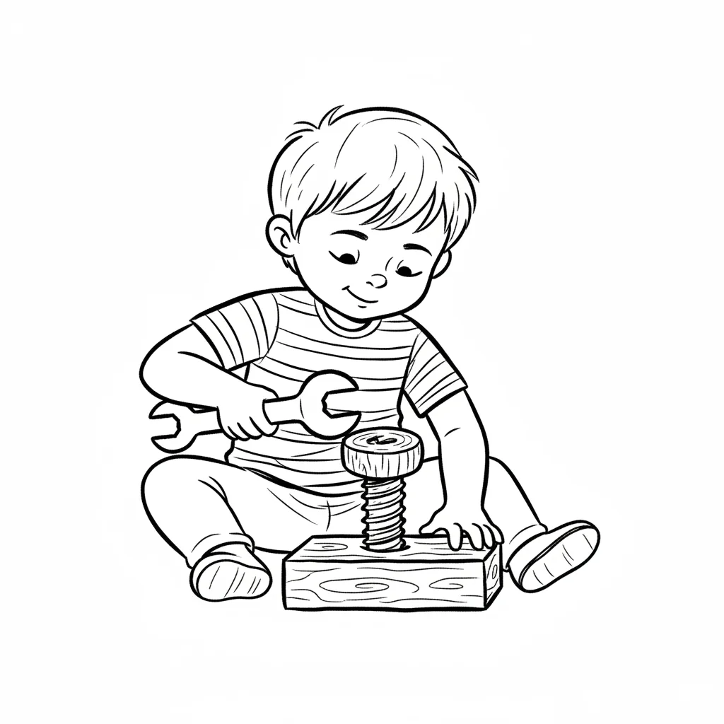 Ein lächelnder Junge benutzt einen Schraubenschlüssel an einer Schraube in einem Holzblock.