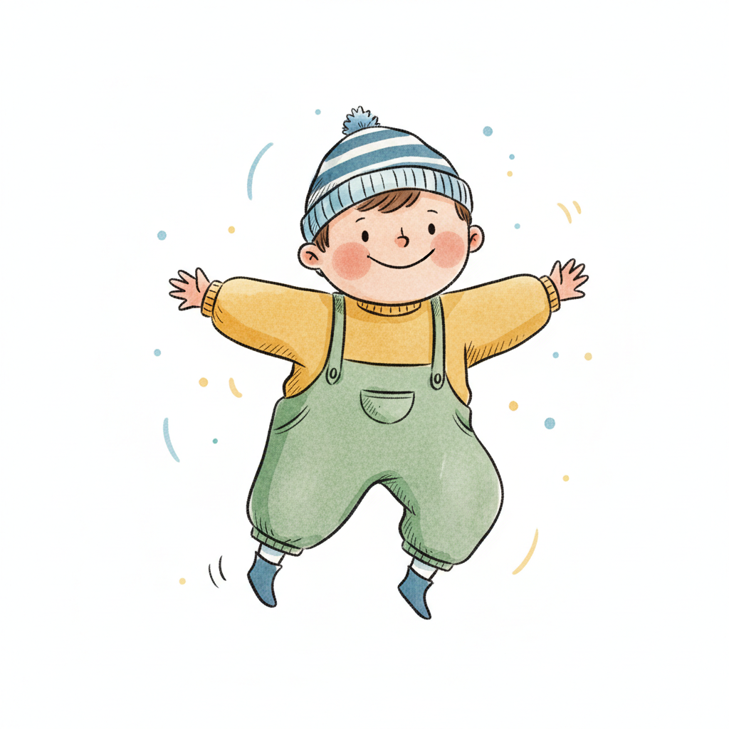 Glücklicher Cartoon-Junge mit Mütze und Latzhose springt fröhlich mit ausgebreiteten Armen.