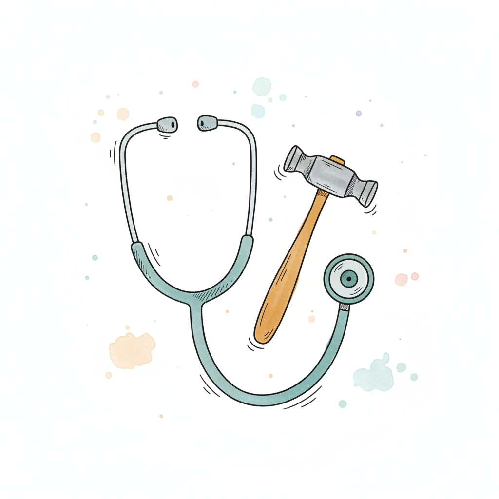 Skizzierte Illustration eines Stethoskops und eines Hammers mit Farbspritzern im Hintergrund.